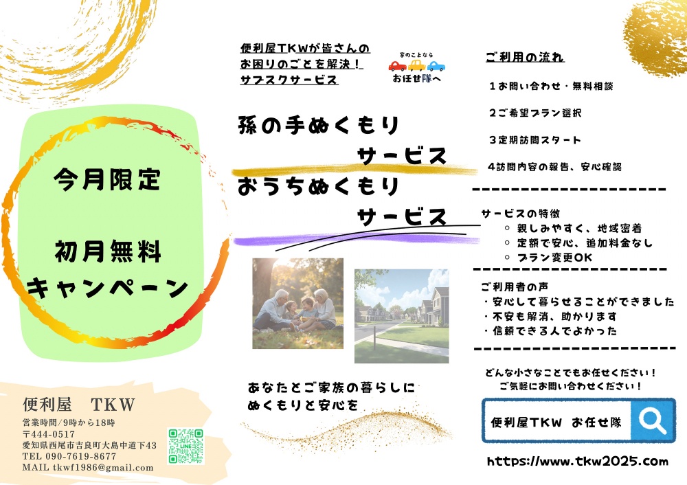 TKWでは、皆さんのお困りごとを解決するサブスクサービスを始めました🎉✨孫の手ぬくもりサービス👨🦳👩🦳おうちぬくもりサービス🏡🚗あなたとご家族の暮らしにぬくもりと安心を届けていきます🤗⭐️10月限定⭐️初月無料キャンペーン🌈を実施しております‼️ぜひ、詳しい内容はお問い合わせを!気軽にご相談ください!