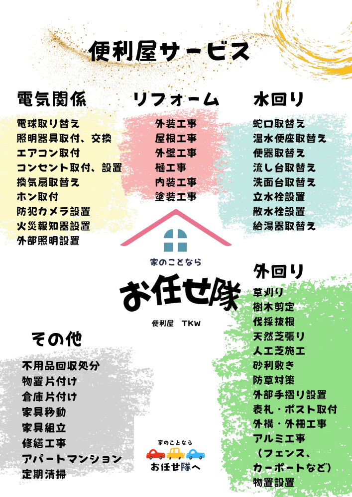 家のお困りごと、ちょっとやって欲しいこと、不用品回収、片付け、家の修理してほしいこと、なんでもご相談ください💪