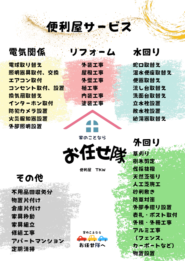 便利屋TKWは、愛知県西尾市・三河地域を中心に、『便利屋の【枠】を超えた、住まいの総合パートナー』として、日常のお困りごとから専門的なサポートまで幅広く対応しています。